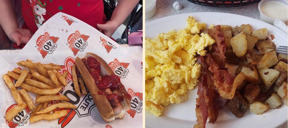 Route 40 Classic Diner serves breakfast, lunch, and dinner daily. It’s an ideal spot for an early breakfast or a late-night meal.